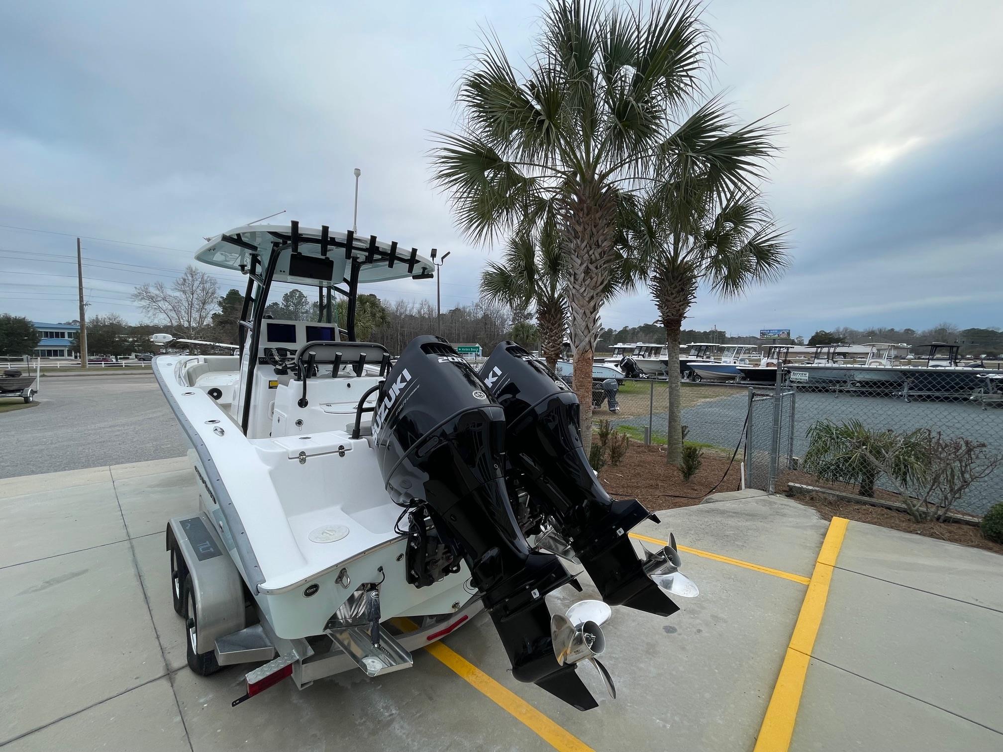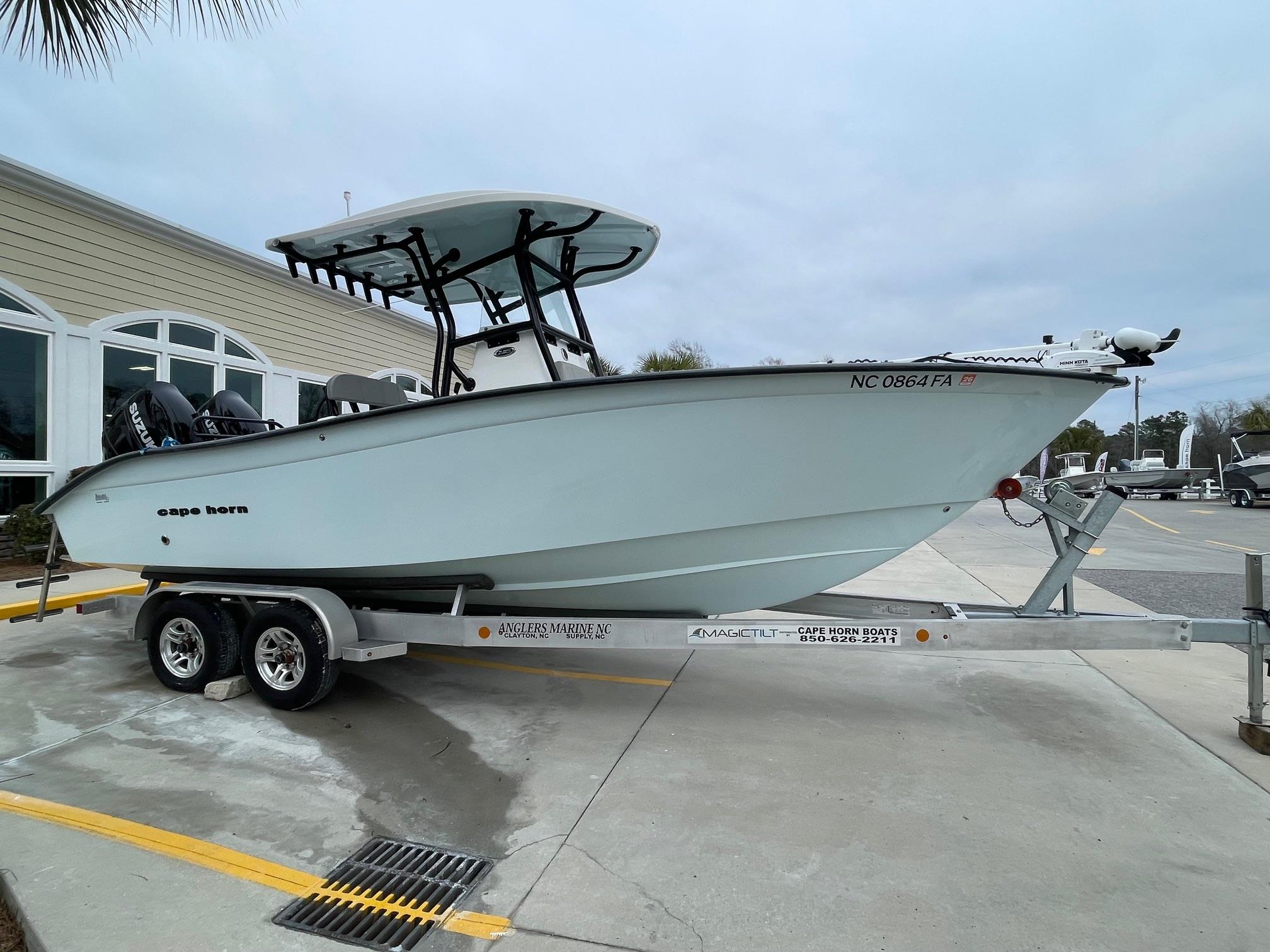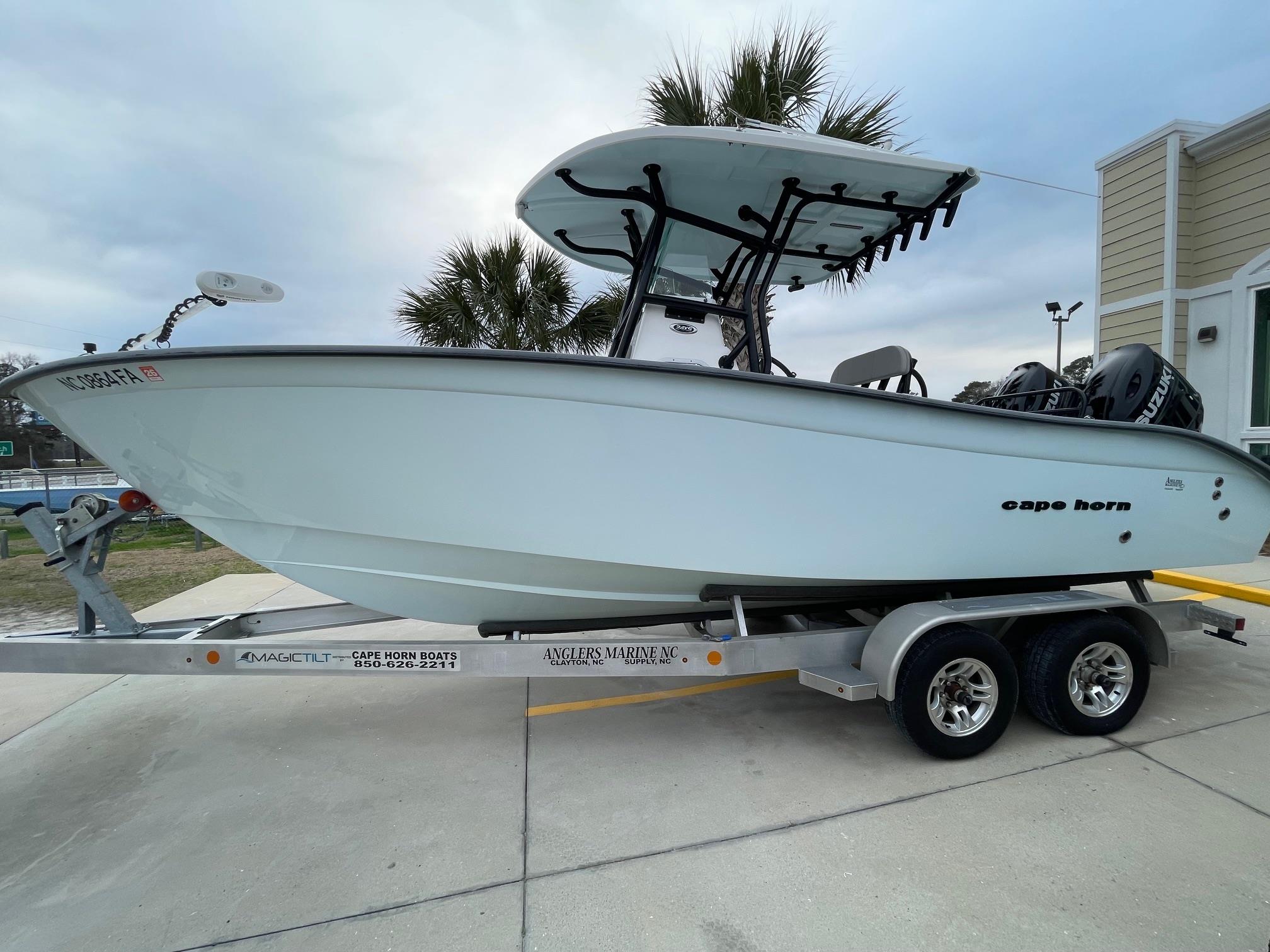 This 2023 Cape Horn 24XS center console is powered by twin Suzuki 200's with 156 HOURS. It's loaded with electronics including dual Simrad GPS/Fishfinders, Minn Kota Terrova trolling motor, VHF radio, and more! This boat comes loaded with standard features including electric trim tabs with indicators, a 20 Gallon freshwater system, and a transom tuna door. It's versatility is impressive due to it's ability to handle serious offshore fishing trips or a day out with family and friends. Come see this boat at our Supply, NC location or call 910-755-7900 for more information.