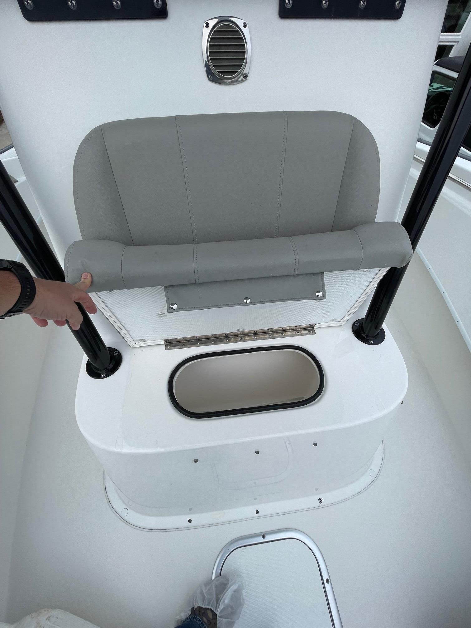 -Black powder coated leaning post with backrest, rod holders, and Gray cushions