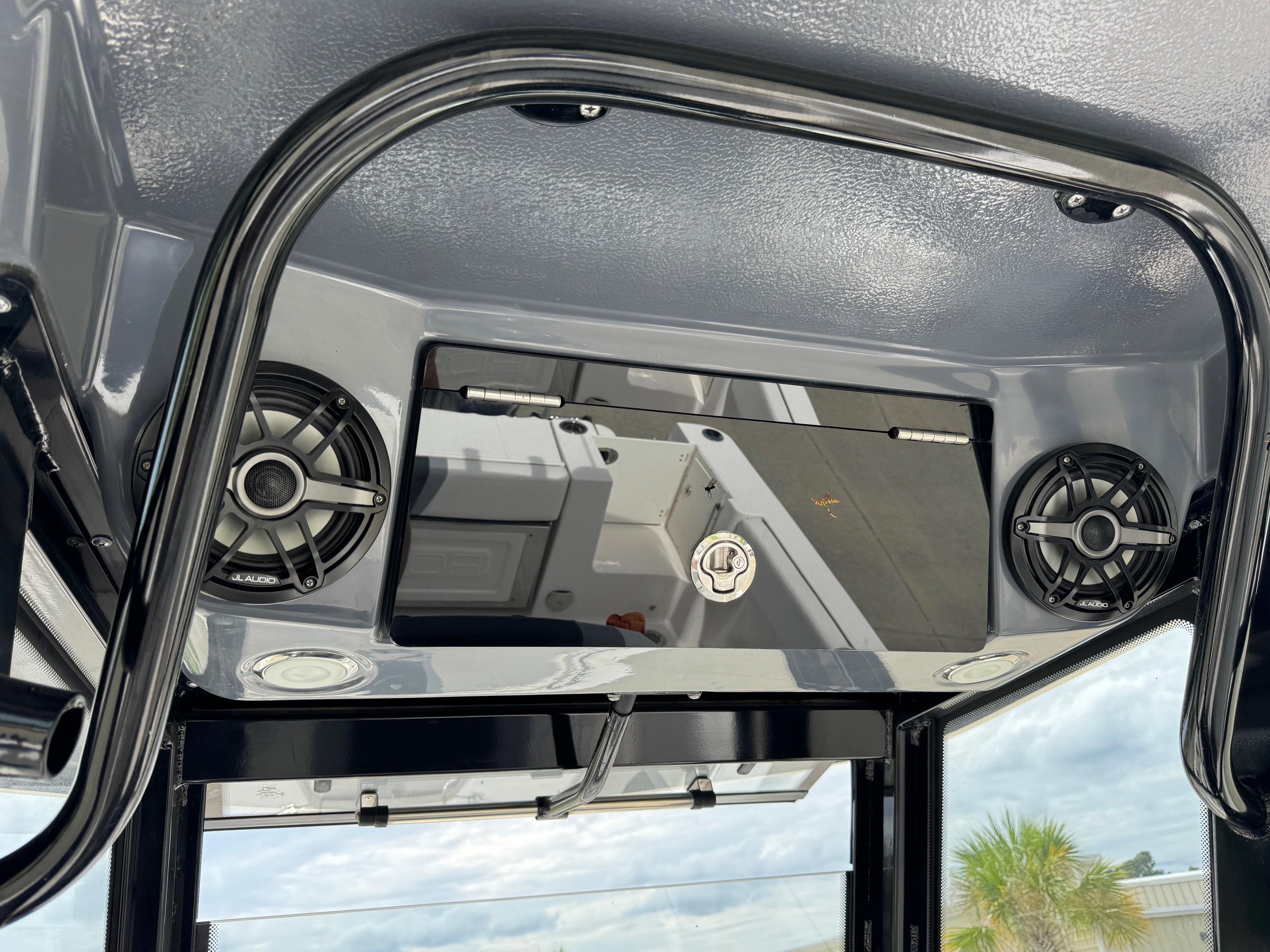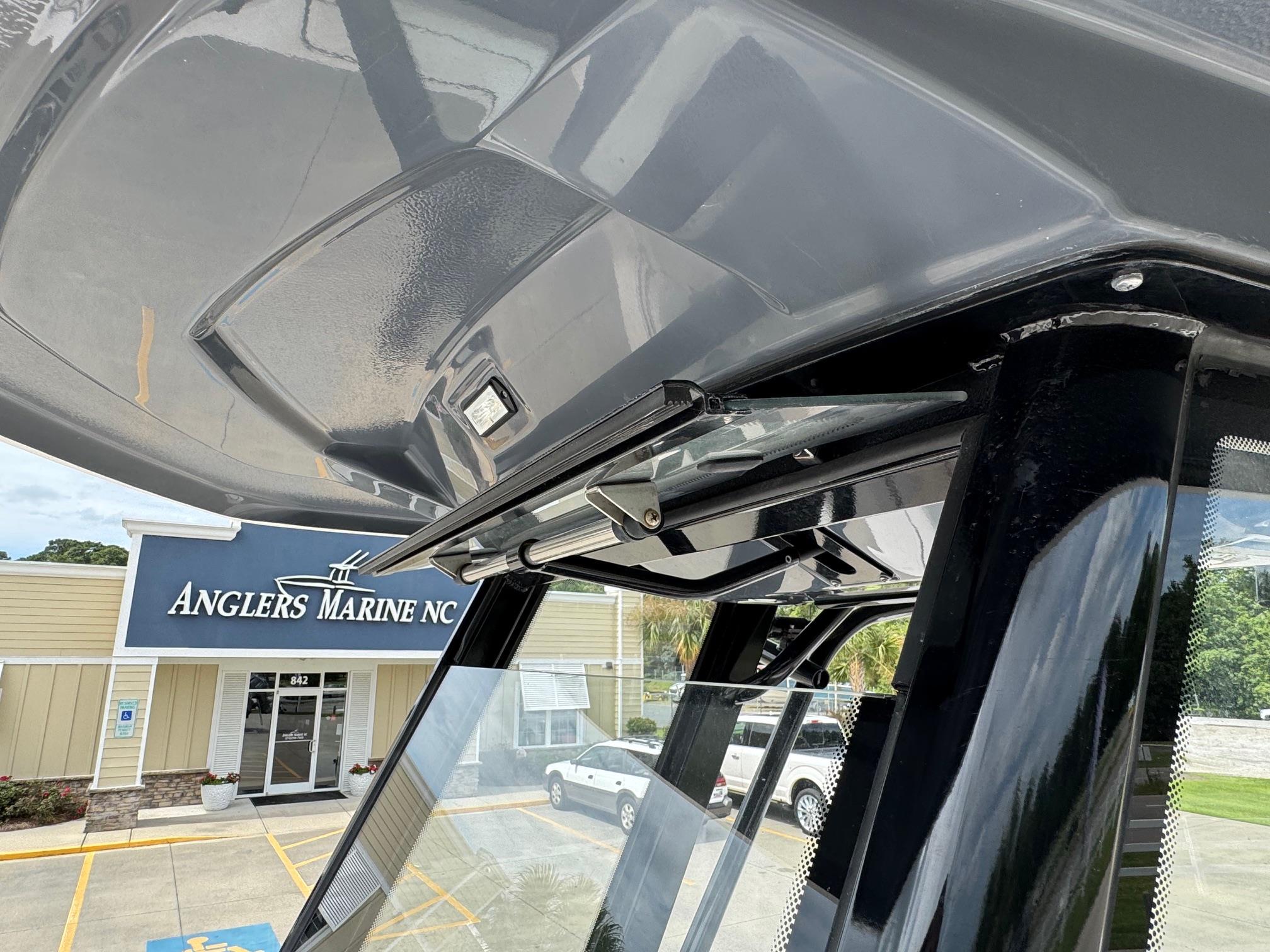-Black powder coated hard top with rod holders, LED spreader lights, electronics box, and glass windshield with upper vent