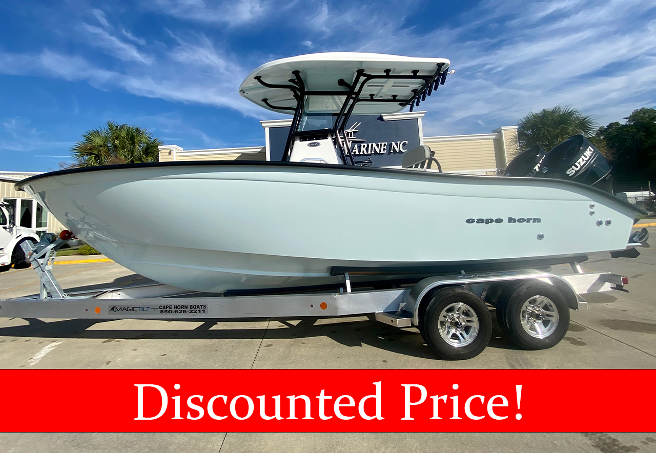 This 2024 Cape Horn 24 XS (Extra Seating) Center Console is powered by twin Suzuki 200's. This boat comes loaded with standard features including electric trim tabs with indicators, a 20 Gallon freshwater system, and a transom tuna door. It's versatility is impressive due to it's ability to handle serious offshore fishing trips or a day out with family and friends. Come see this boat at our Morehead City, NC location or call 252-773-0099 for more information.