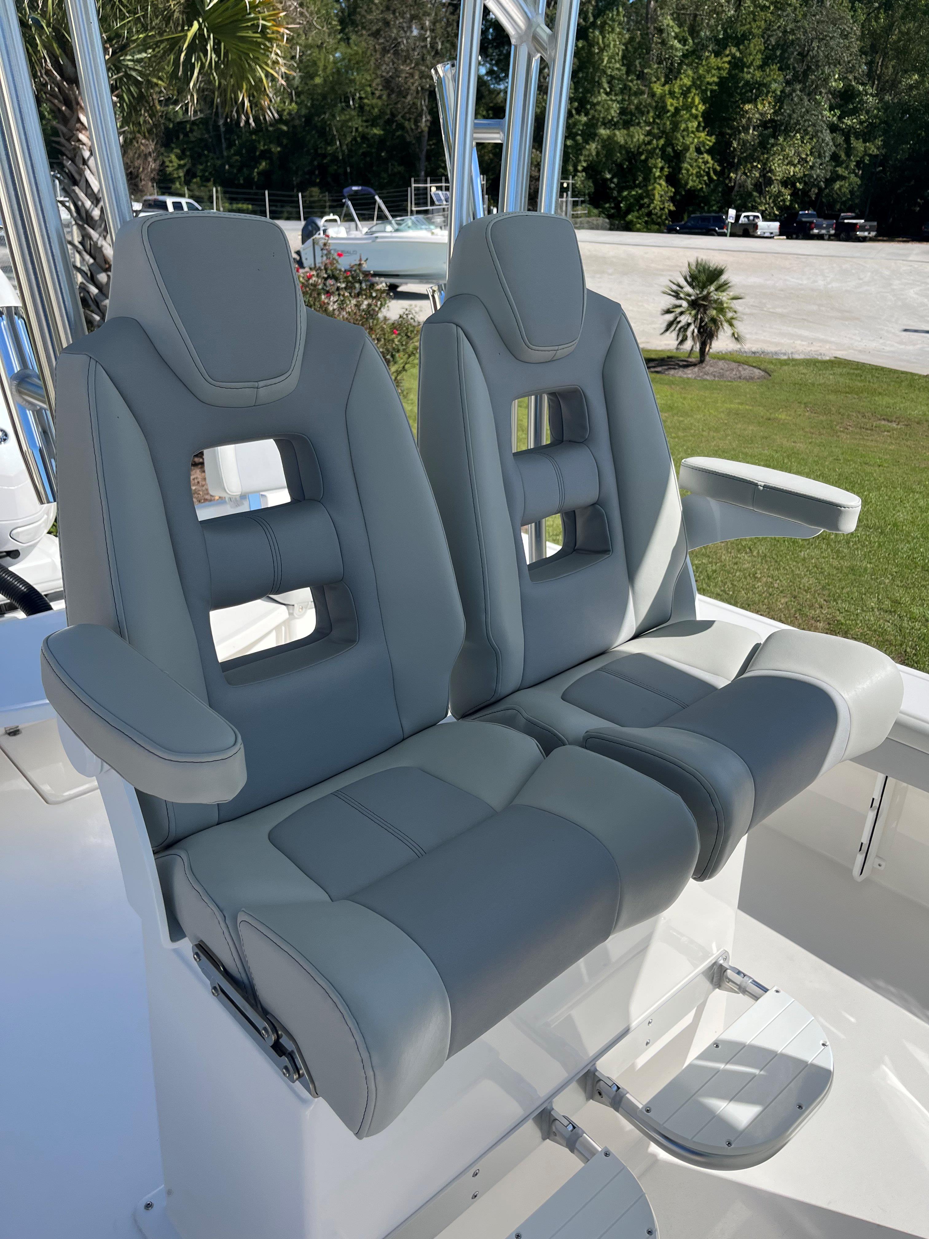 -Deluxe helm captain's chairs with storage box, footrests, folding bolsters and arm rests