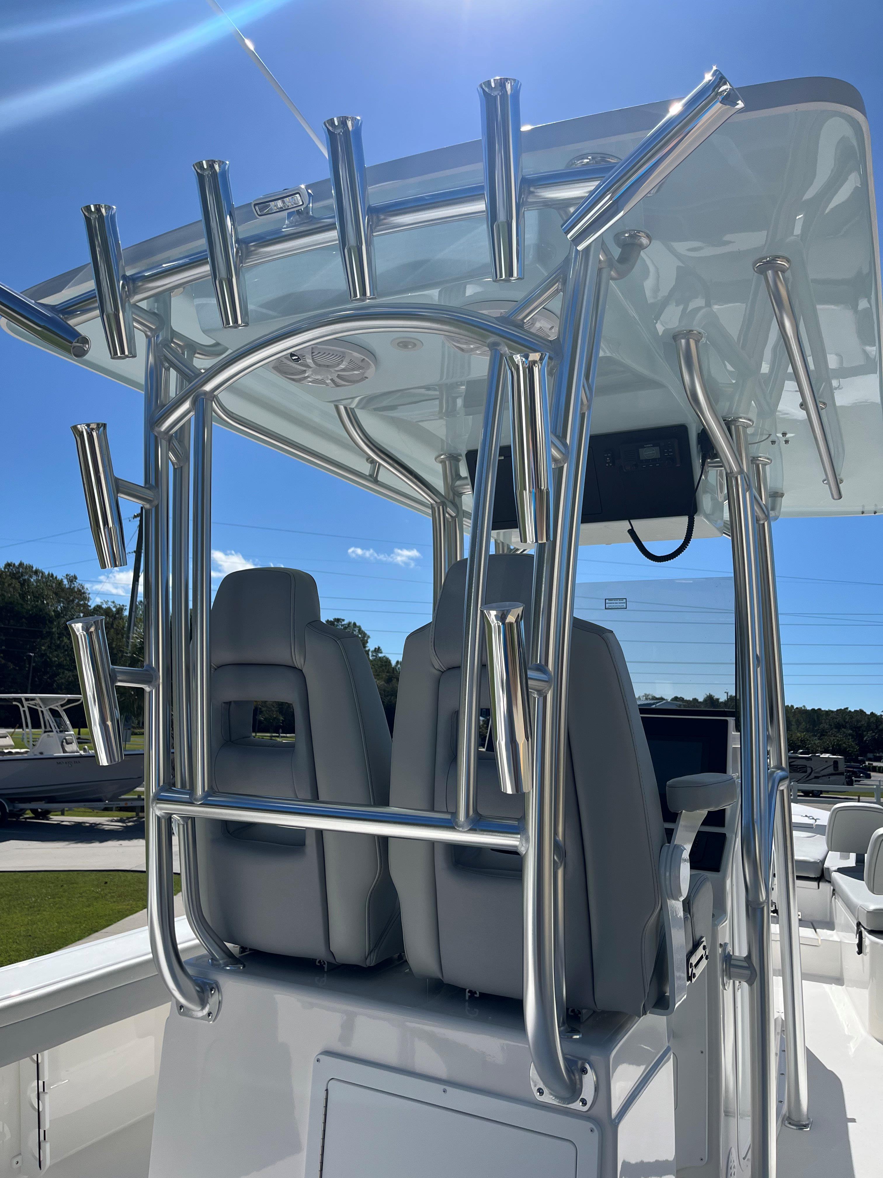 -XL deluxe Hard top with electronics box, 6 rod holders, LED spreader lights, rear support with 4 extra rod holders, Wetsounds speakers, and Nassau Blue underside accent