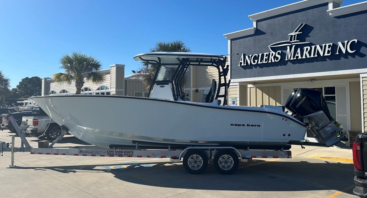 This 2026 Cape Horn 28XS center console is powered by Twin Mercury 300XXL Verados. Everything needed for an advantage over the others has found its way into the new 28XS. This modern hull design has the angler in mind from the start. A huge 42 gallon live well and a 700 quart fish box invites envy before you even leave the dock. With this being the extra seating model, it has full bow seating with cushions and backrests along with the folding rear bench seat. To learn more, please visit our Supply, NC location, or give us a call at (910) 755-7900!