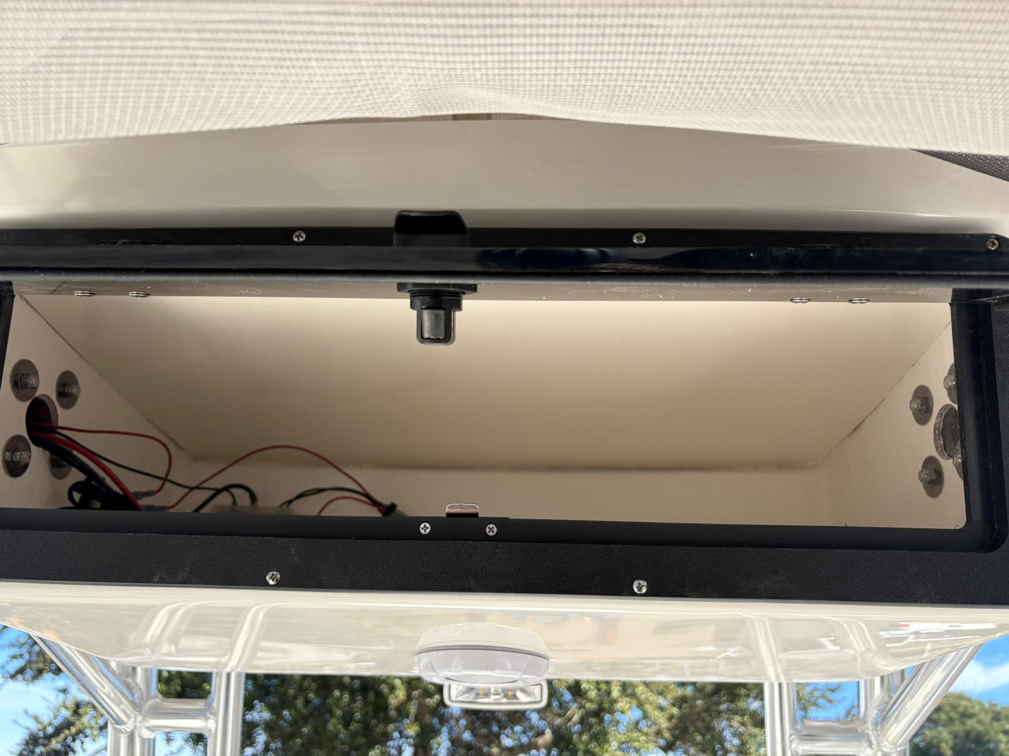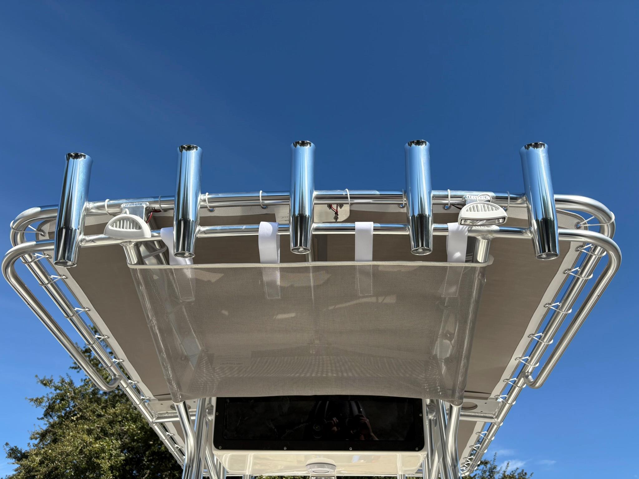 -Black powder coated T-Top with LED spreader lights, electronics box, rod holders, cargo net, and black canvas