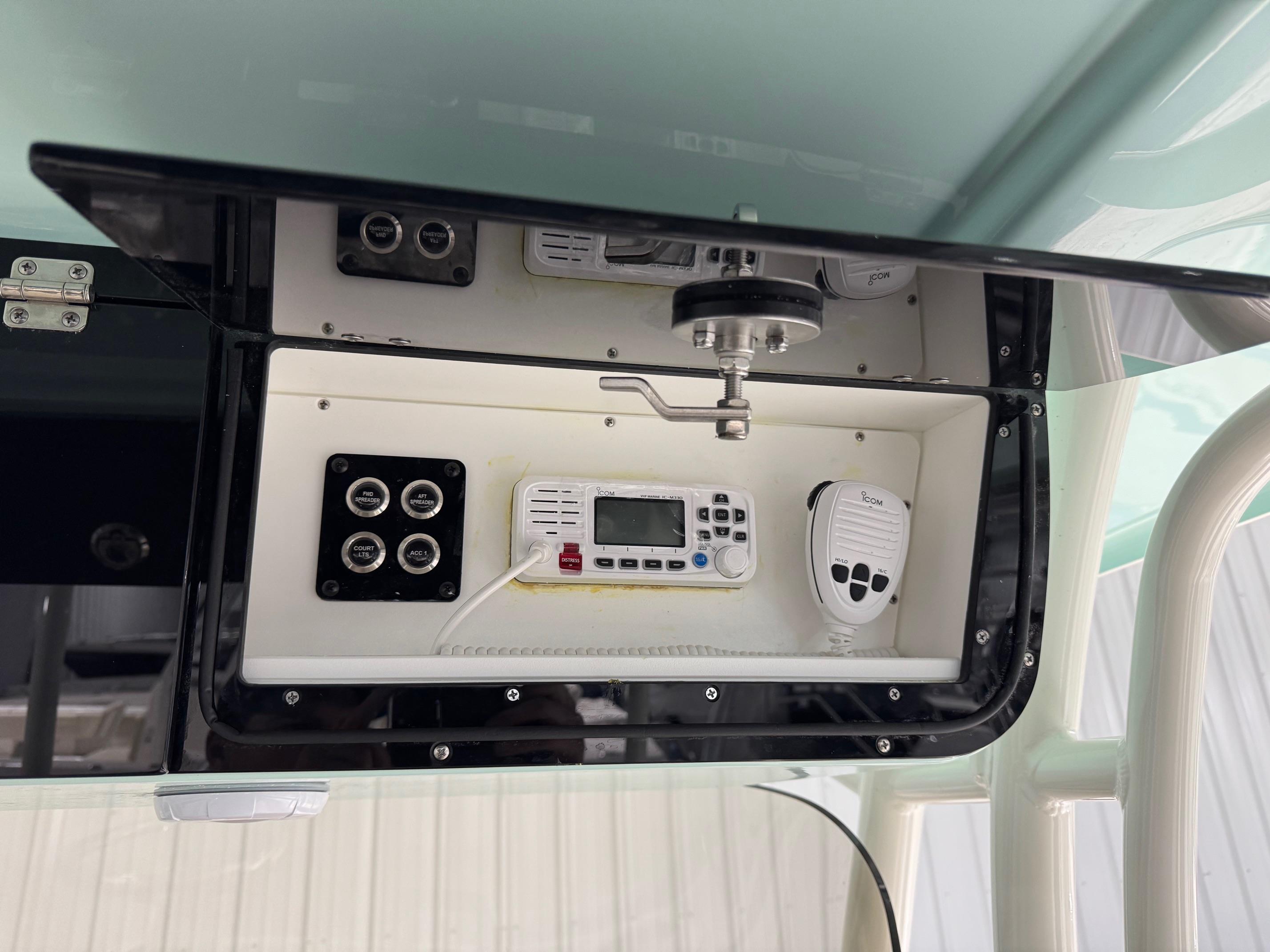 -White powder coated hard top with LED spreader lights, storage compartments, interior LED lights, and rod holders