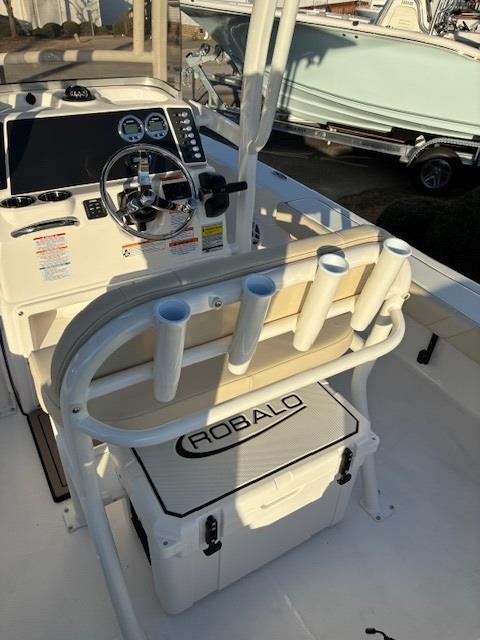 This 2026 Robalo 226 Cayman is powered by a Yamaha 200HP outboard. Everything that's special about Robalo's Cayman series gets bigger and better with the 226! It has a big boat feel and is perfectly suited for a wide variety of conditions whether fishing or cruising. With features like bow and aft seating that can covert to casting platforms, mulitple livewell's and fish boxes, a large head area, and more! This boat is located at our Clayton, NC location and for more information give us a call at 919-585-7900.