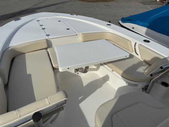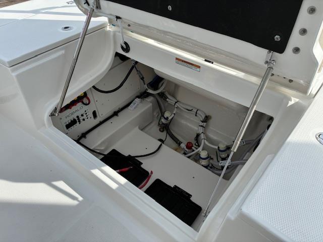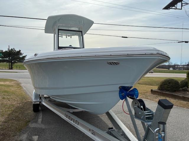-White powder coated hard top with LED spreader lights, rod holders, and electronics box