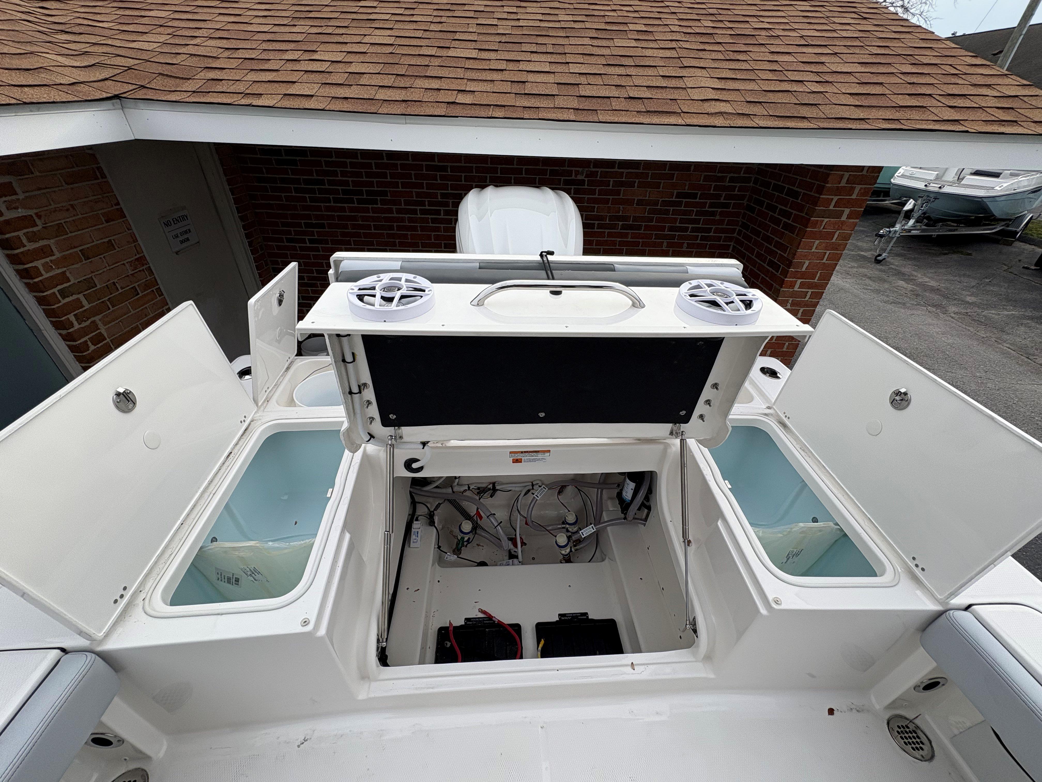 -White powder coated hard top with LED spreader lights, electronics box, and rod holders