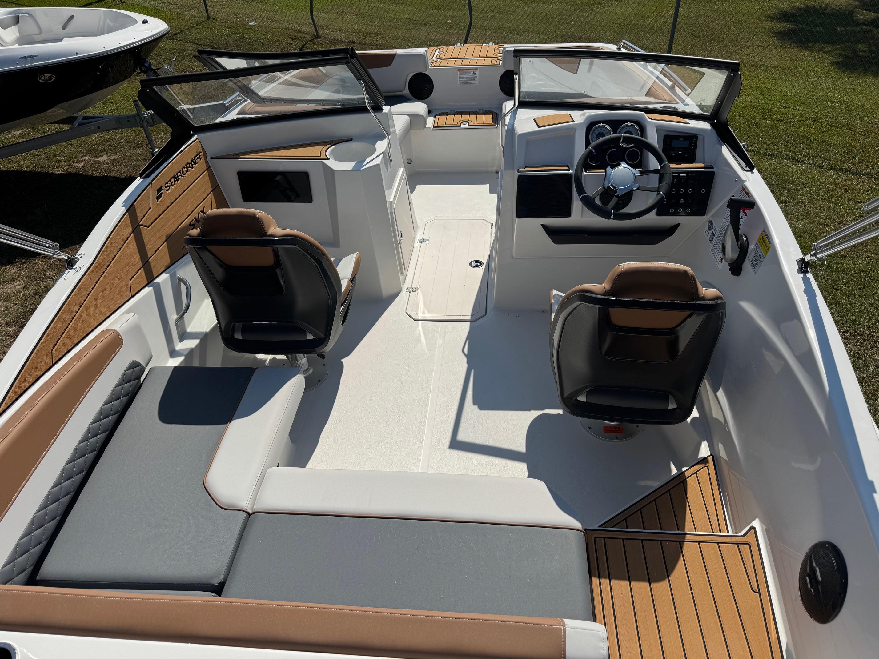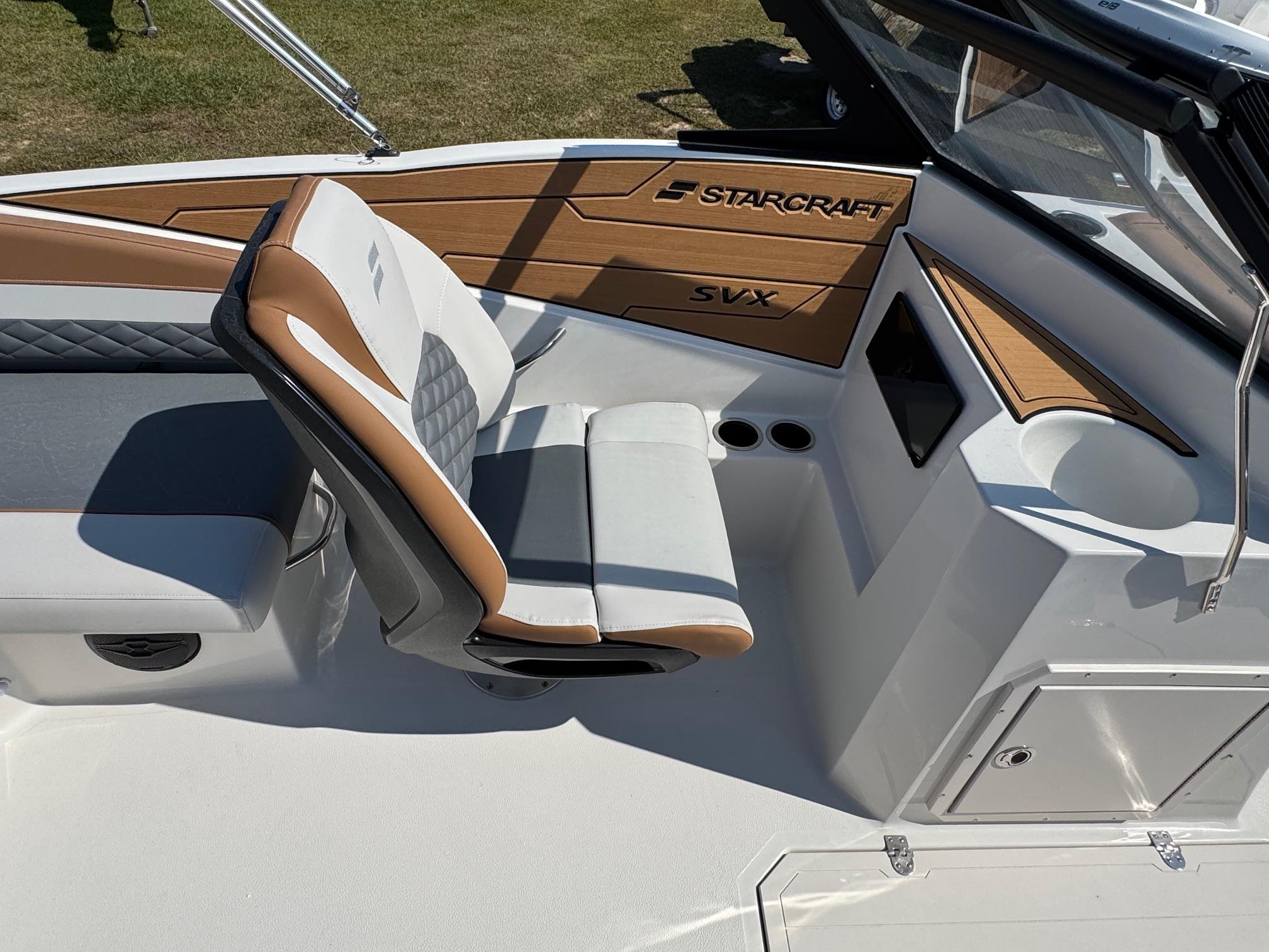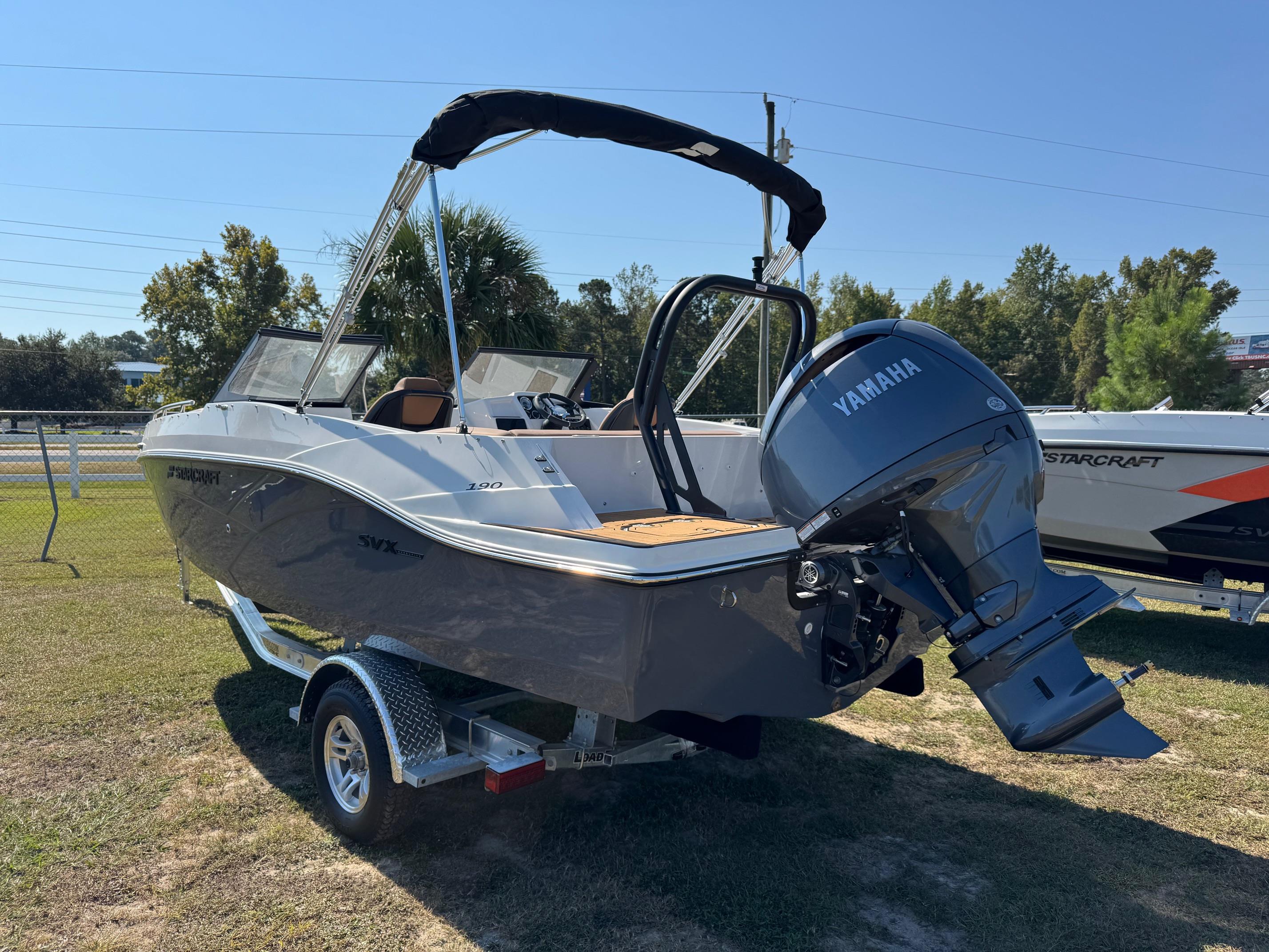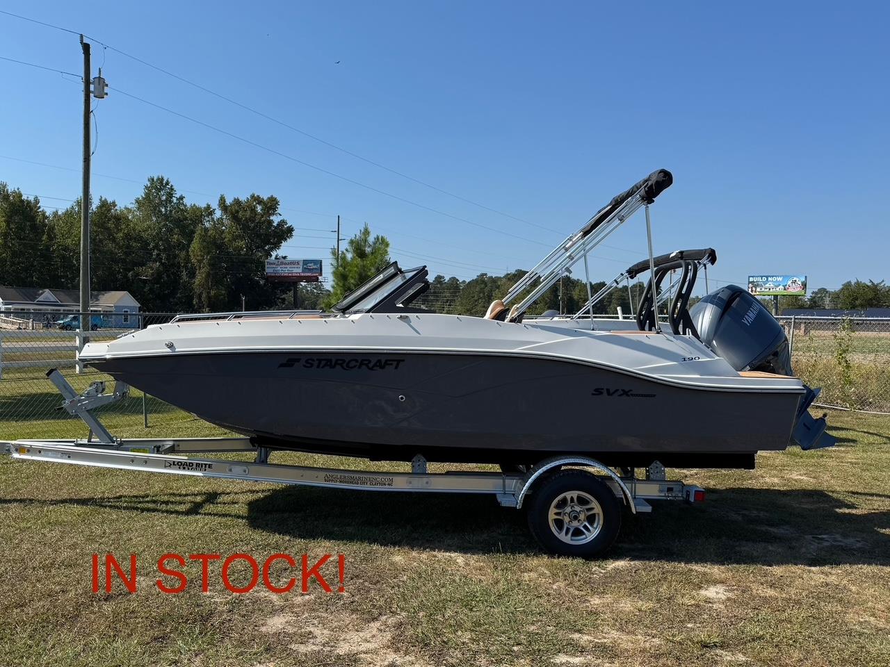 This 2026 Starcraft SVX 190 deck boat comes with a Yamaha F150. There are eight different models of spacious deck boats to choose from in the SVX lineup between 17 and 23 feet. The 190 comes loaded with value; with a large bimini top for sun protection, AM/FM stereo with bluetooth, EVA soft touch marine flooring, and hydraulic tilt steering.