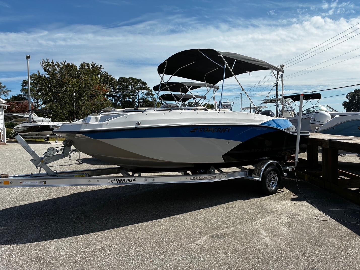 This 2026 Starcraft SVX 191 comes with a Yamaha VF115 SHO. It's one of the seven spacious deck boats in the SVX fleet and it comes loaded with value; including a AM/FM stereo with bluetooth, a large bimini top for sun protection, and EVA soft touch marine flooring. To learn more please visit our Clayton, NC location, or give us a call at (919) 585-7900!